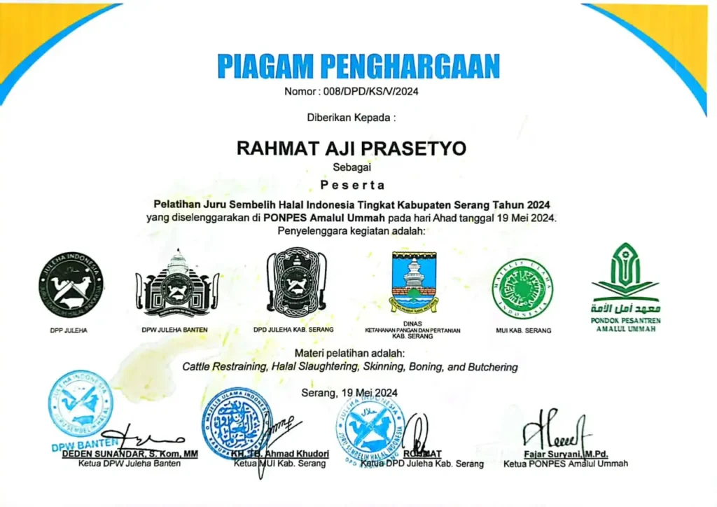 Ajip Aqiqah telah tergabung dengan Aspaqin, HPDKI, serta memiliki Juru Sembelih Halal Bersertifikat dan telah dipercayai banyak pelanggan.
